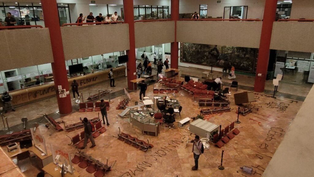 Durante esta acción realizaron la destrucción de mobiliario, equipo de cómputo, cristales de ventanillas de cobro y cables de máquinas generadoras de actas de nacimiento.