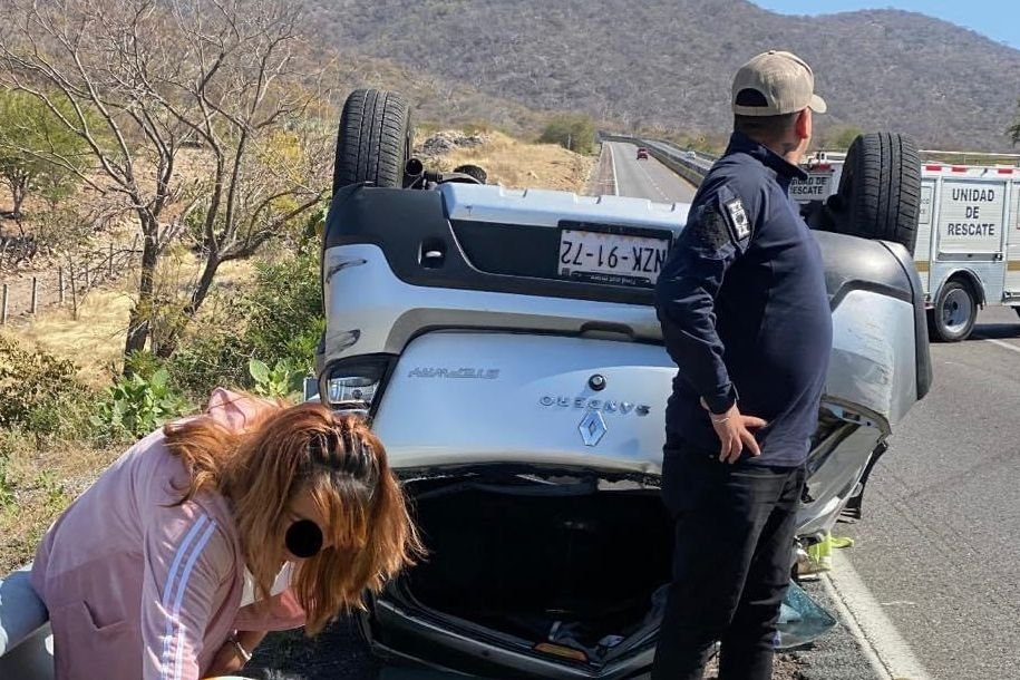 Lugar hasta donde llegaron elementos de los Ángeles Verdes quienes dieron primeros auxilios a los tripulantes del vehículo de la marca Renault tipo Sandero color plata, el cual quedó volcado con las llantas hacia arriba aún costado de la carretera.