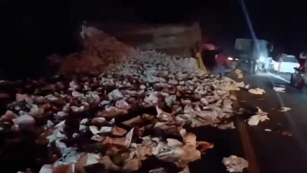 Fue cerca de las 08:00 de la noche cuando se reportó el siniestro vial en donde un camión resultó volcado y atropellado por su contenido, quedó regado sobre la carretera.