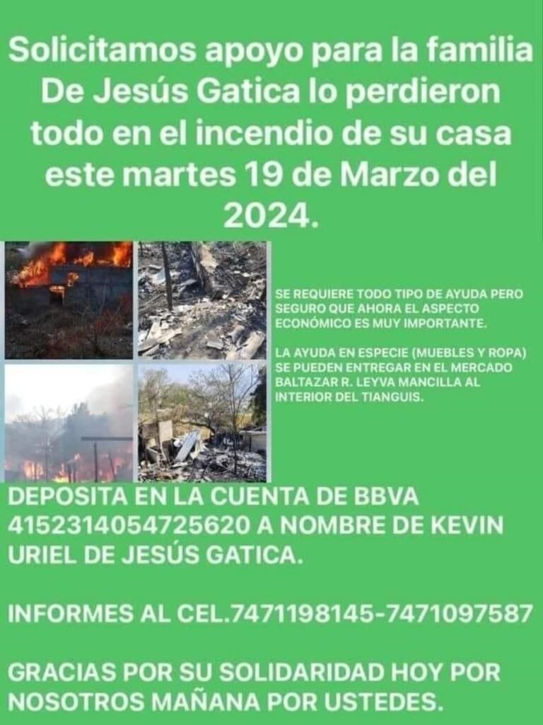 El pasado 19 de marzo se registró un incendio cerca del punto conocido como “Barranca de las Calaveras”, ubicada unos metros arriba del mercado “Baltazar R. Leyva Mancilla”, en dónde el saldo fueron tres viviendas incendiadas; a una semana de estos hechos una de las familias afectadas pide el apoyo de la ciudadanía para poder recuperar un poco de todo lo que ha perdido.