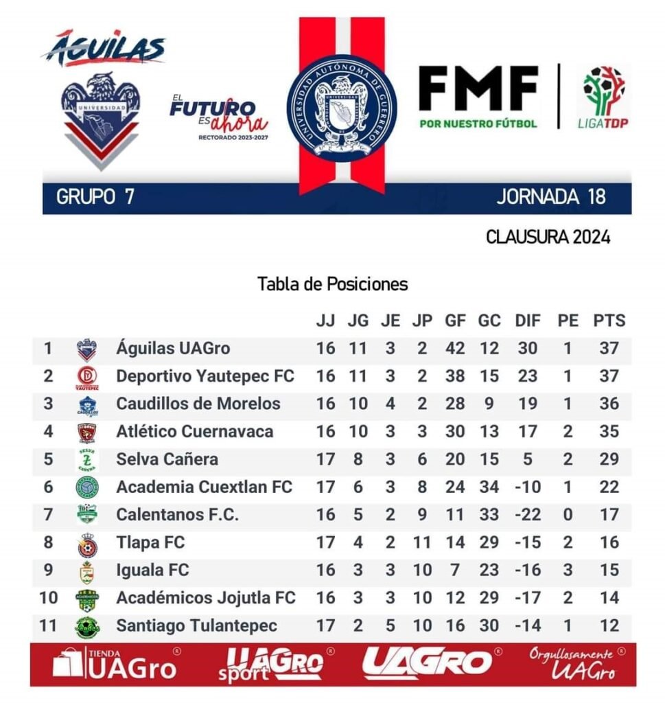 Las Águilas de la UAGro se mantienen como líderes del grupo 7 de la Tercera División Profesional (TDP) y en el puesto 21 de la tabla general, posición que les vale para pelear por el ascenso.