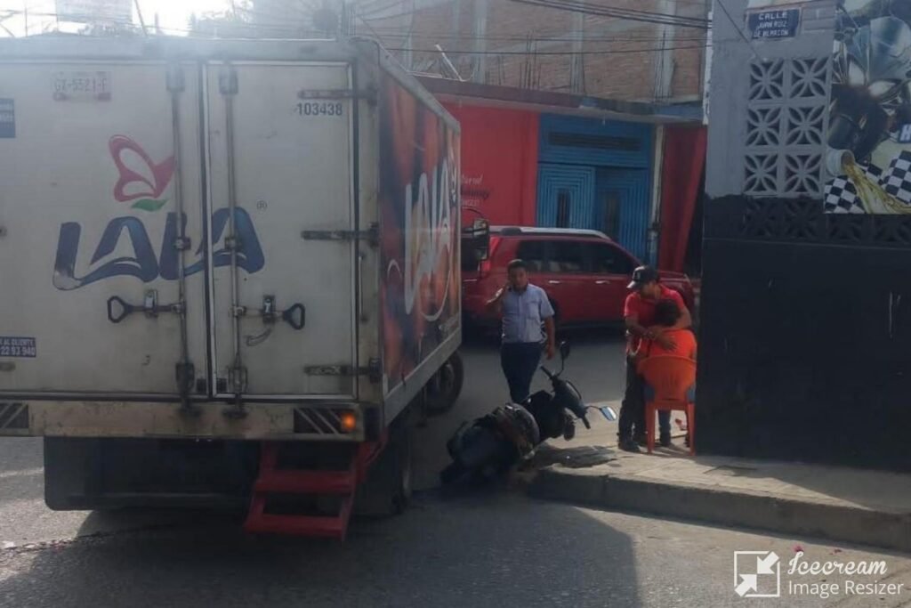 Una pareja que viajaba en una motocicleta fue atropellada por un camión repartidor cuando circulaban sobre la calle Benito Juárez, en el municipio de Ometepec.