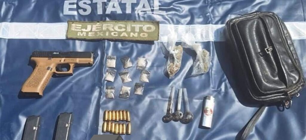 La asegurado es un arma de fuego tipo escuadra, dos cargadores, 14 cartuchos útiles, nueve dosis de la droga conocida como cristal, dos bolsas de plástico con marihuana y tres pipas.