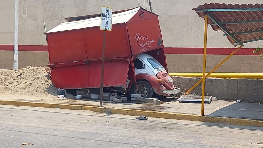El taxi, de color rojo con blanco, terminó impactado contra una caseta perteneciente a la empresa Coca-Cola, ubicada en la vía pública, frente al supermercado Soriana.