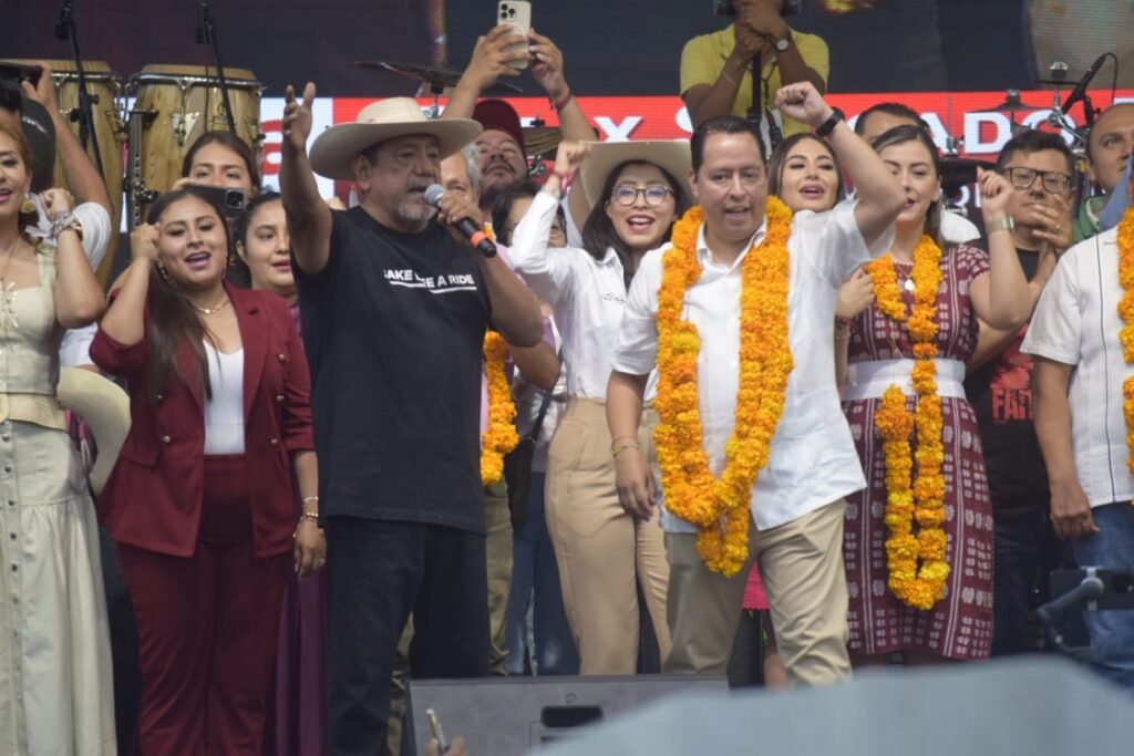 Este martes, el aspirante morenista cerró campaña en la explanada de la Plaza Cívica Primer Congreso de Anáhuac acompañado su esposa Alondra Marroquín Sánchez; su mamá Herlinda Parra Ocampo, y del candidato al Senado, Félix Salgado Macedonio.
