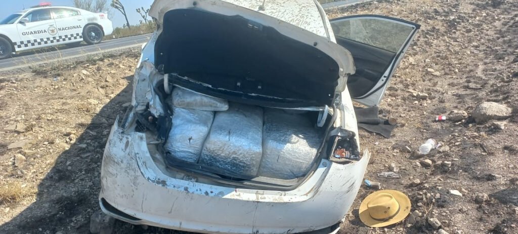 En cumplimiento de la Estrategia Nacional de Seguridad Pública, en Zacatecas, elementos de la Guardia Nacional (GN) aseguraron un cargamento de aproximadamente 50 kilos de marihuana dentro de un vehículo siniestrado.