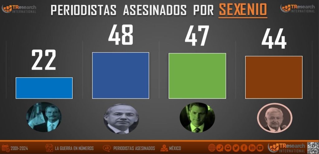 Durante el mandato de Peña Nieto, TResearch contabilizó 47 comunicadores asesinados, mientras que en el gobierno de Calderón la cifra fue de 48.