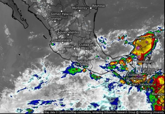 Las condiciones climatológicas serán generadas por un Canal de Baja Presión, en interacción con la Vaguada Monzónica y dos Zonas de Inestabilidad con potencial ciclónico ubicadas al sur del Golfo de México y frente a las costas de Guerrero, Oaxaca y Chiapas.