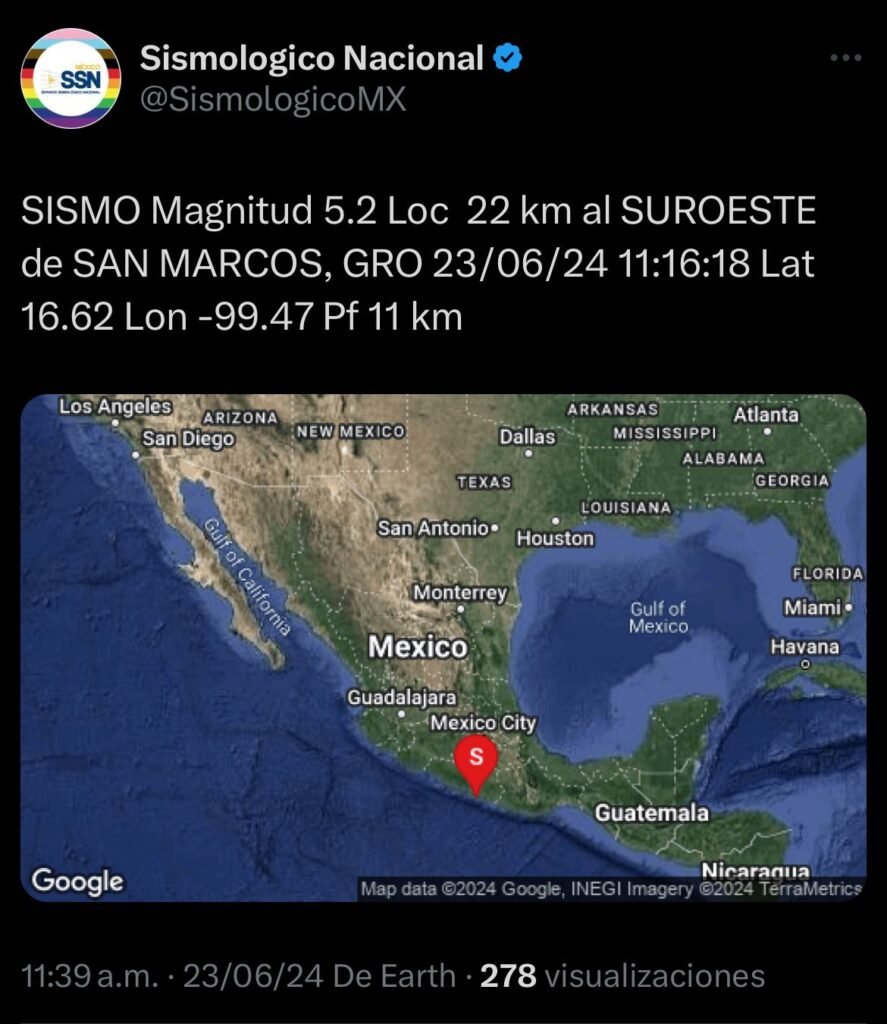Apenas un minuto después a las 11:16 de la mañana, se registró un segundo movimiento telúrico de magnitud 5.2 con epicentro a 22 kilómetros al suroeste de San Marcos.