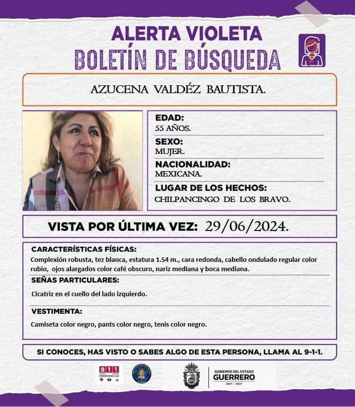 Las autoridades han emitido una Alerta Violeta por la desaparición de Azucena Valdez Bautista, de 53 años, en la capital del estado. Su paradero es desconocido desde el pasado sábado.