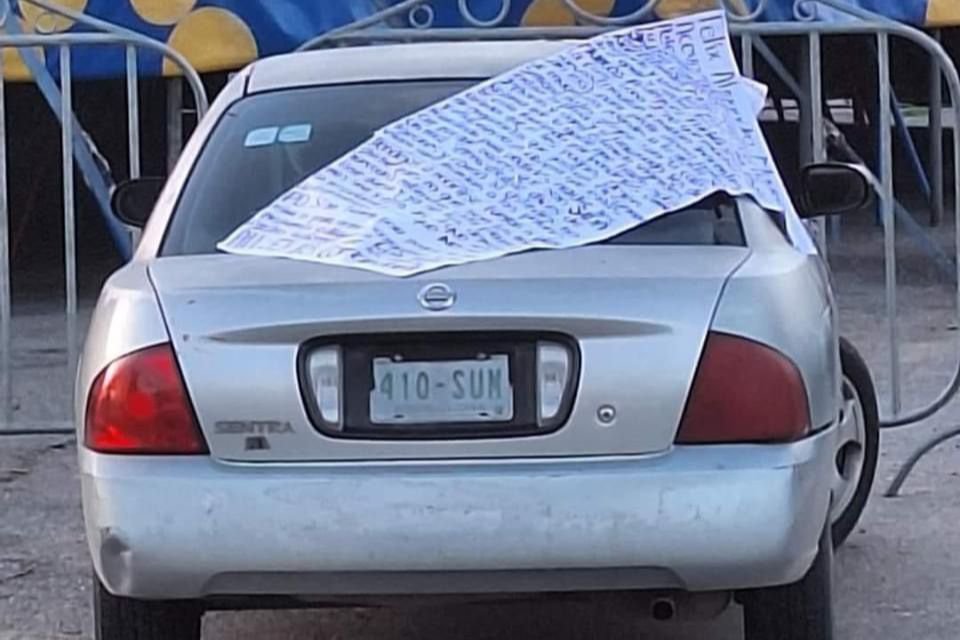 Sobre el vehículo de la marca Nissan tipo Sentra abandonado se había localizado una cabeza humana cercenada y algunas cartulinas con mensajes que no fueron revelados por parte de las autoridades.