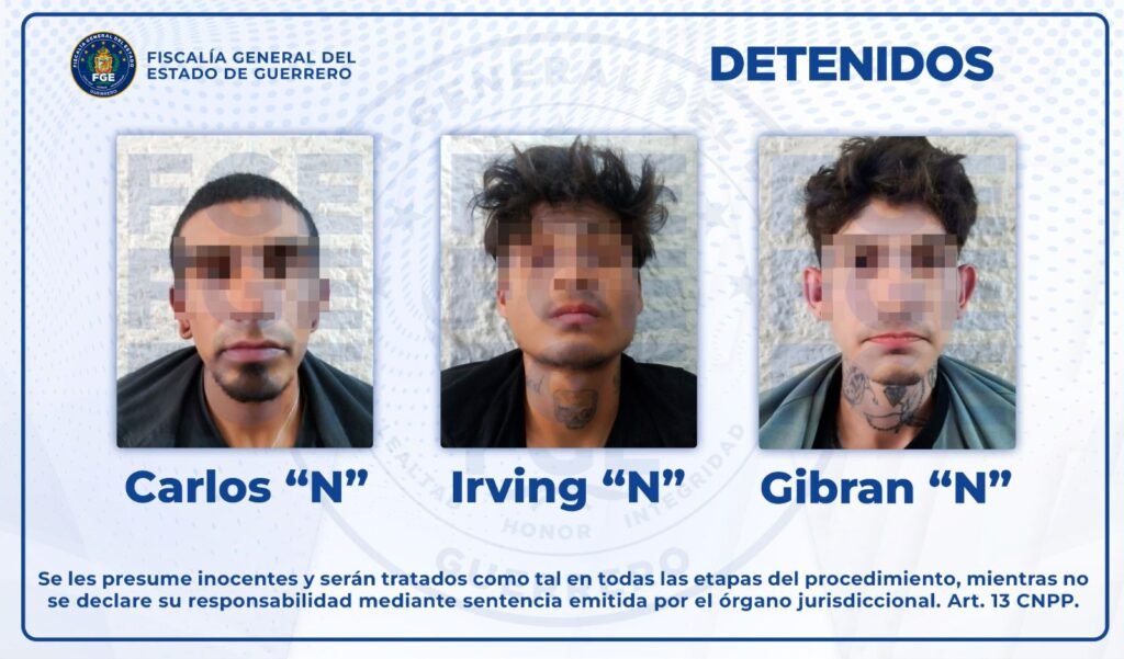 A través de un comunicado, la Fiscalía General del Estado de Guerrero informó que, en acciones coordinadas con el Ejército Mexicano, la Guardia Nacional y la Policía Estatal, se logró la detención en flagrancia de Irvin “N”, Carlos “N” y Gibran “N”. Durante esta operación, se les aseguraron armas largas y cortas, posible droga y una motocicleta en Chilpancingo.