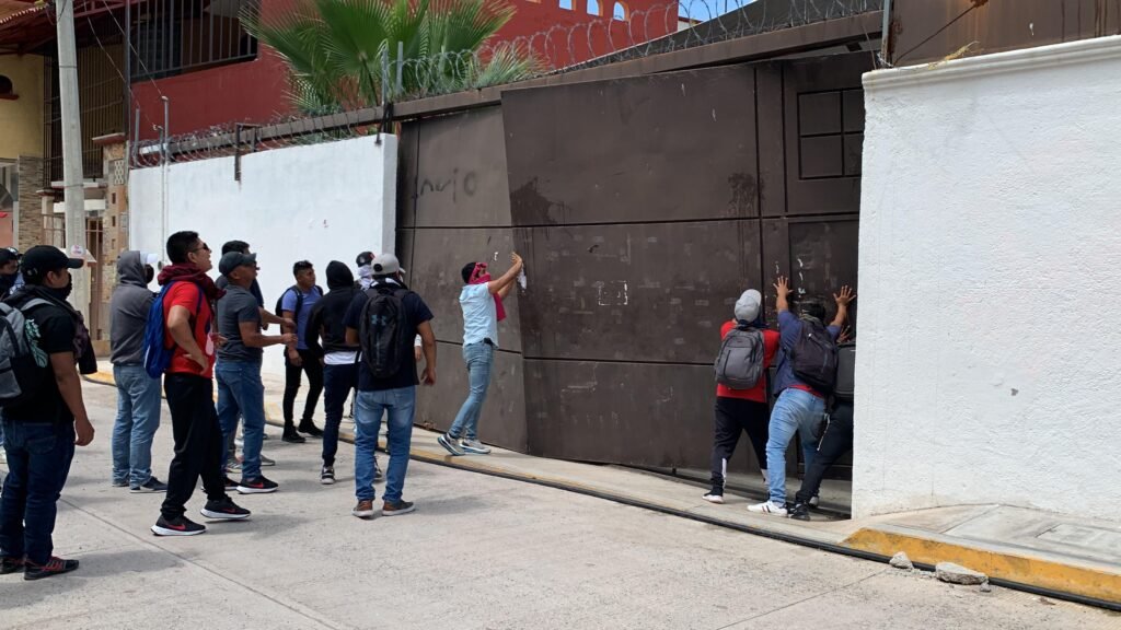 Después de unos minutos de haber iniciado la manifestación, los egresados comenzaron a golpear y empujar uno de los portones de acceso al inmueble, el cual lograron abrir para ingresar a las instalaciones. Dentro, causaron destrozos lanzando piedras a los vidrios y cristales del lugar, así como derribando electrodomésticos y equipos de cómputo.
