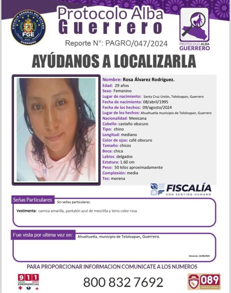 Rosa Álvarez Rodríguez fue vista por última vez el 9 de agosto en su comunidad, de acuerdo a la ficha de búsqueda, la mujer tiene el cabello castaño y chino, ojos cafés oscuros, de complexión mediana y tez morena.