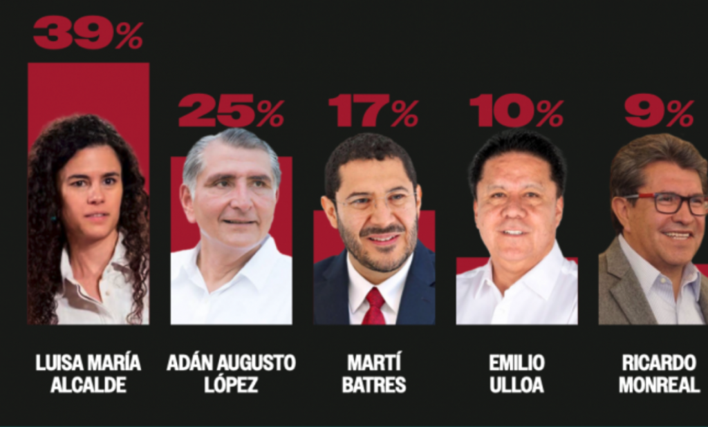 En cuanto a la identificación partidista, el 60 por ciento de los encuestados se asocian con Morena. Dentro de la población abierta, Luisa María Alcalde lidera las preferencias con un 35 por ciento, seguida por Adán Augusto con 21 por ciento, Martí Batres con 15 por ciento, Emilio Ulloa con 8 por ciento y Ricardo Monreal con un 6 por ciento.
