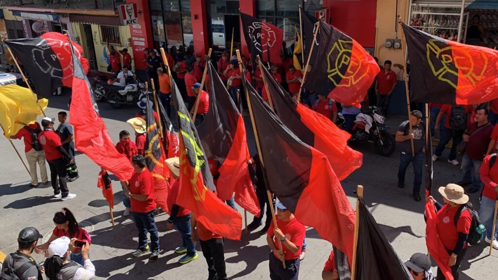 La movilización hizo una parada en el edificio Vicente Guerrero, en donde una comisión ingresó para recibir la toma de nota de la sección 2 de ese sindicato, con sede en el municipio de Florencio Villarreal.