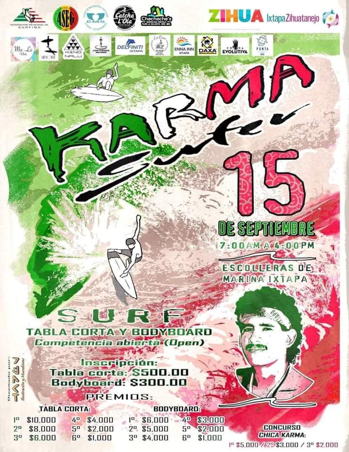 La premiación del evento tendrá lugar en Catcha L’ola Ixtapa a partir de las 7:00 PM, donde se celebrará el espíritu del surf y la vida de “El Karma” con una gran fiesta para todos los asistentes.
