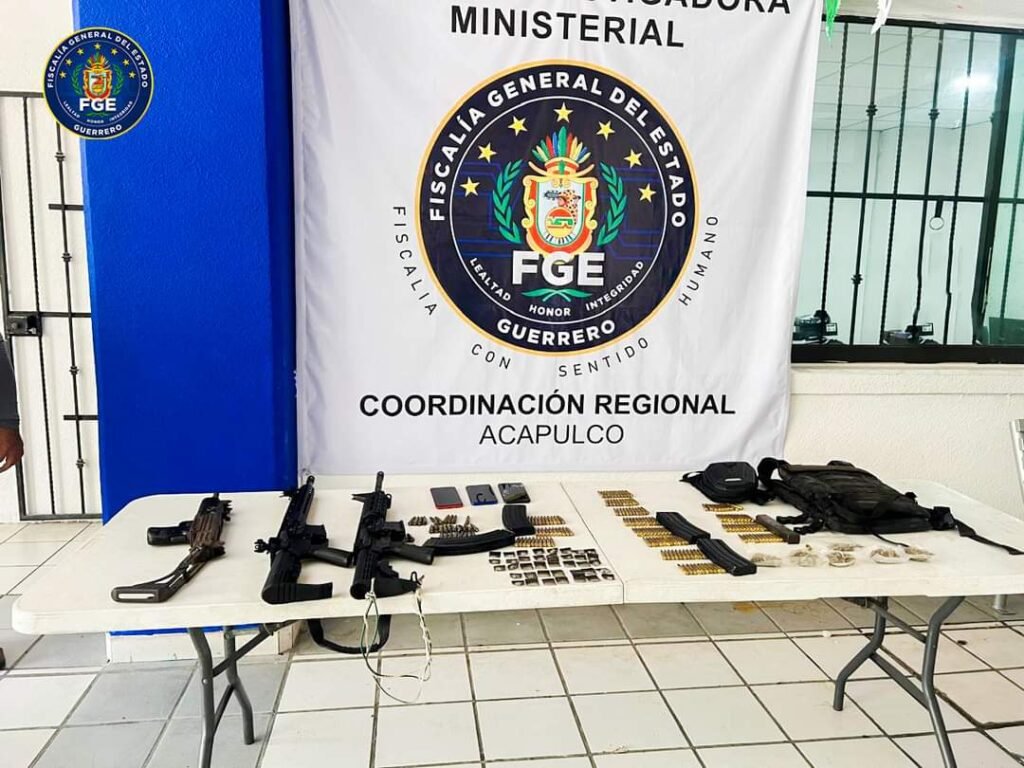 ACAPULCO. — La Fiscalía General del Estado, en coordinación con el Ejército, Guardia Nacional y Policía estatal, logró la detención de un hombre y una mujer, así como el aseguramiento de armas, cartuchos, cargadores, equipo táctico, vehículos y droga.