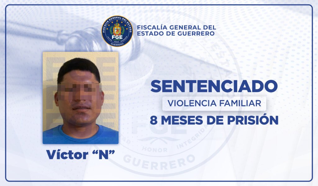 La Fiscalía General del Estado de Guerrero, logró que un juez dictara sentencia condenatoria de 8 meses de prisión en contra de Víctor “N”, por el delito de violencia familiar, cometido en perjuicio de una personas, en Zihuatanejo de Azueta.
