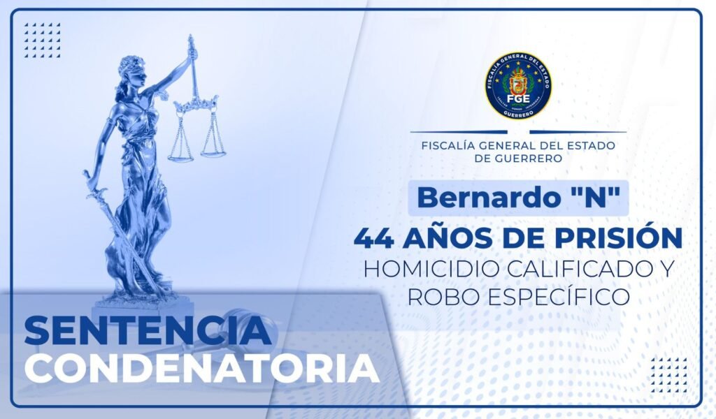 La Fiscalía General del Estado de Guerrero (FGE) logró una sentencia condenatoria de 44 años de prisión en contra de Bernardo “N”, acusado de homicidio calificado y robo específico en perjuicio de Morelos “N”, por hechos ocurridos el 25 de noviembre de 2008 en Chilpancingo.