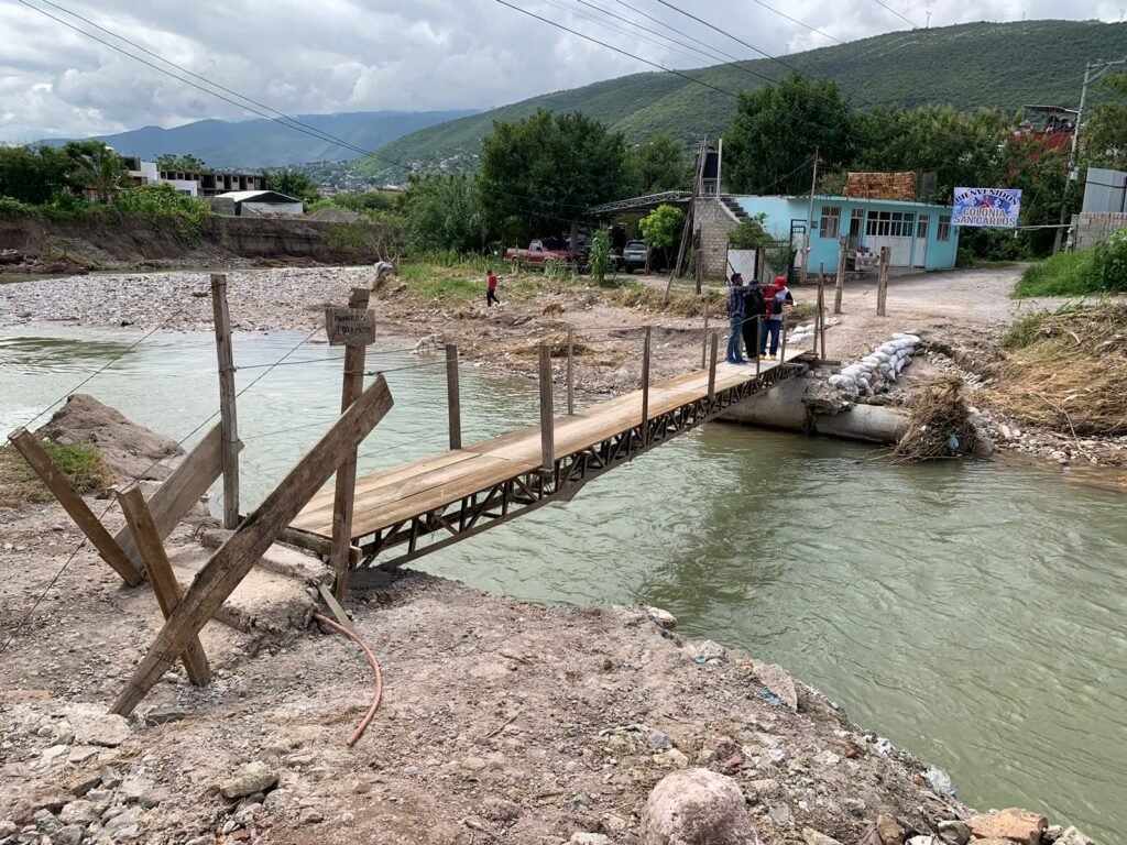 Vecinos de las colonias Amate Amarillo, Las Brisas y San Carlos, ubicadas al norte de la capital, a unos metros de los vertederos de la presa, construyeron un puente peatonal improvisando con madera y alambres, para cruzar a sus hogares, esto debido a que la creciente del río Huacapa y el desfogue de la presa ocasionados por el huracán “John” se llevará su puente de concreto y unas cuantas viviendas.