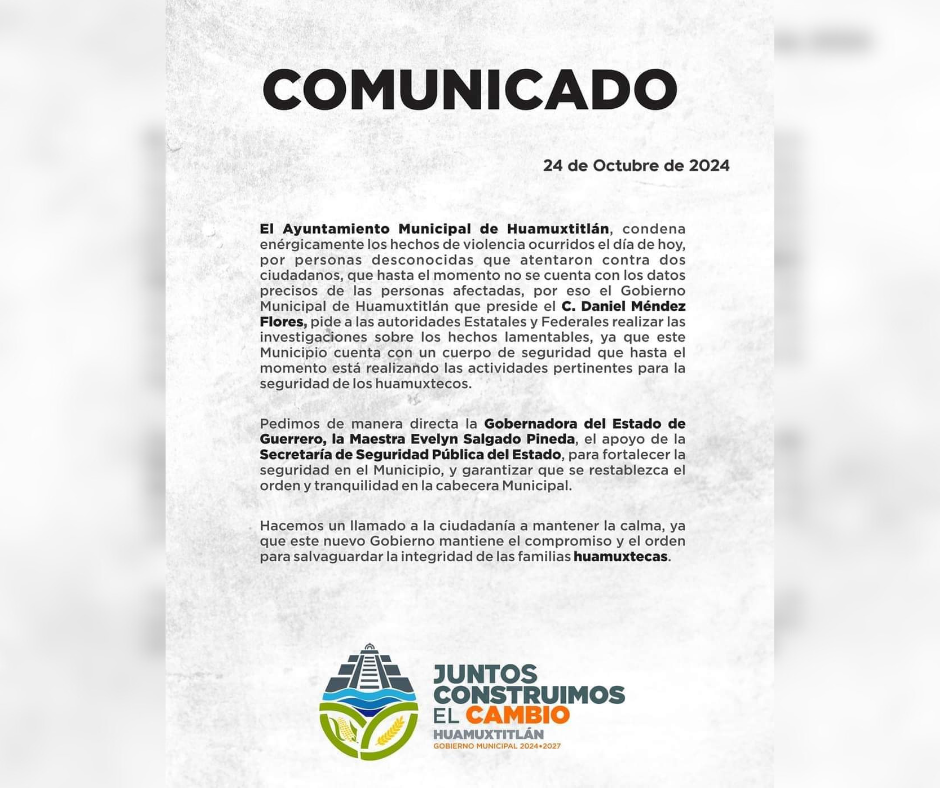 En respuesta a estos hechosel, Presidente Municipal de Huamuxtitlan, Daniel Méndez, a través de la policía municipal emprendió un operativo por las Calles de la Cabecera hasta Totolapa, el cual continúa hasta el momento, para brindar seguridad a la población y, de ser posible, detener a los generadores de violencia de su municipio.