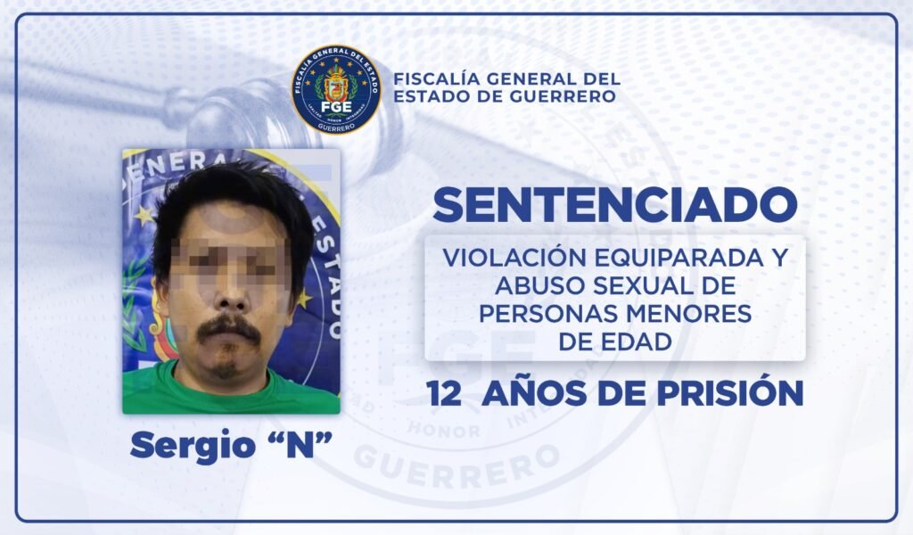 La Fiscalía General de Guerrero logró que un juez dictara sentencia condenatoria de 12 años de prisión en contra de Sergio “N”, por el delito de violación equiparada y abuso sexual de personas menores de edad, cometido en perjuicio de una víctima menor, cuya identidad se reserva, por los hechos ocurridos en Petaquillas, municipio de Chilpancingo.