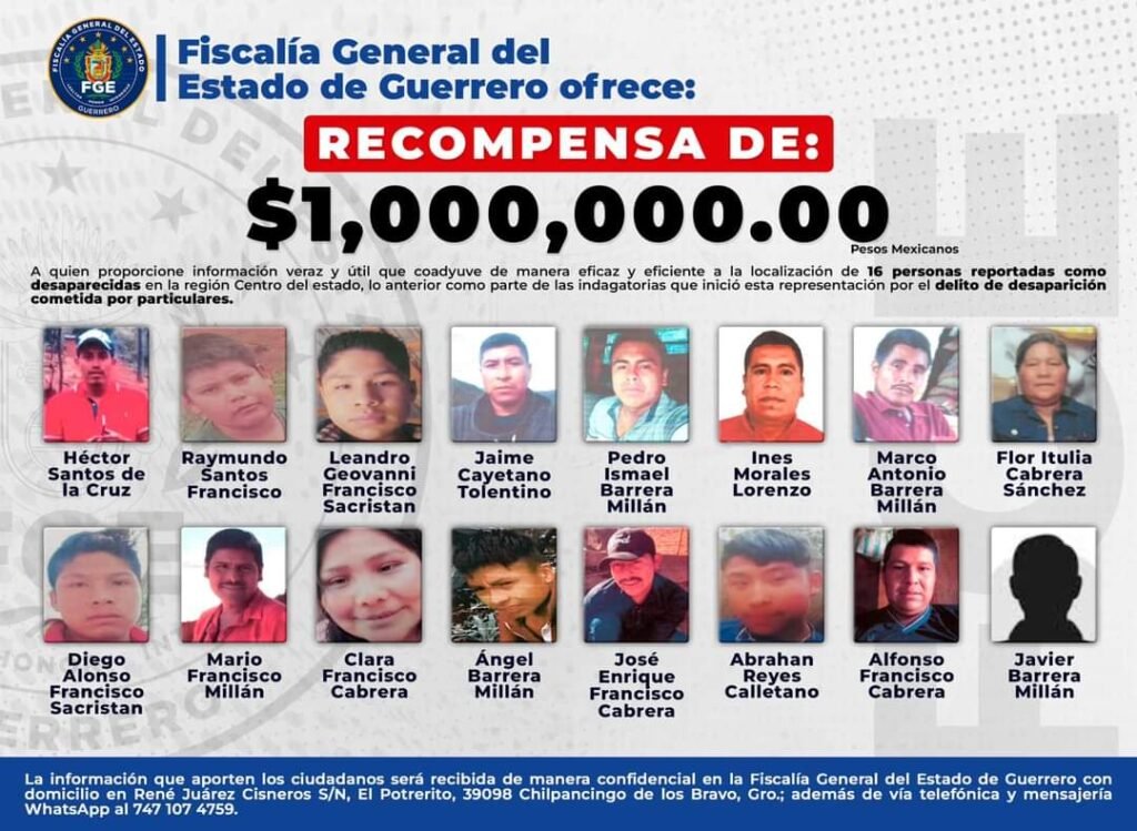 La recompensa de 1 millón de pesos que ofrece la FGE es para localizar a Héctor Santos de la Cruz, Raymundo Santos Francisco, Leandro Geovani Francisco Sacristán, Jaime Cayetano Tolentino, Pedro Israel Barrera Millán, Inés Morales Lorenzo, Marco Antonio Barrera Millán, Flor Itulia Cabrera Sánchez, Diego Alonso Francisco Sacristán, Mario Francisco Millán, Clara Francisco Barrera, Ángel Barrera Millán, José Enrique Francisco Cabrera, Abraham Reyes Cayetano, Alfonso Francisco Cabrera y Javier Barrera Millán.
