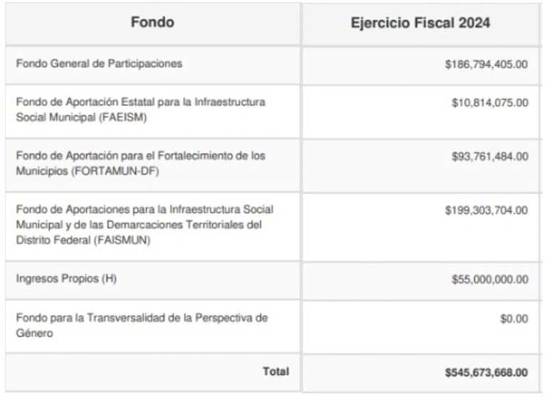 También contempla el Fondo de Aportaciones para la Infraestructura Social Municipal y de las Demarcaciones Territoriales del Distrito Federal (FAISMUN-DF) con 199 millones, 303 mil 704 pesos y 55 millones de pesos por concepto de ingresos propios, por lo que en total el PEGA se integró por 545 millones, 673 mil 688 pesos cuya cantidad es distribuida en 12 ministraciones entregadas durante el año, es decir, cada mes el gobierno local recibe 45 millones 472 mil 805 pesos.