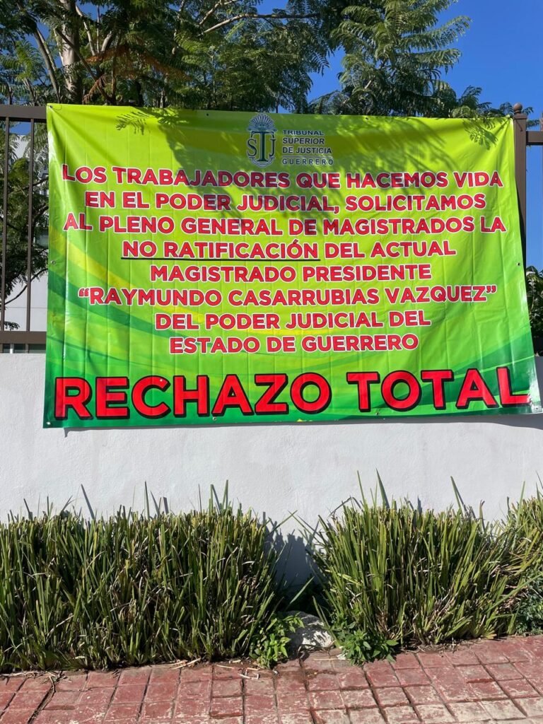 Por ello, la mañana de este viernes, un grupo de trabajadores colocó una lona en el exterior de Ciudad Judicial, expresando su desacuerdo con la reelección de Casarrubias Vázquez, pero minutos después, la lona fue retirada por órdenes directas, según señalaron algunos testigos.