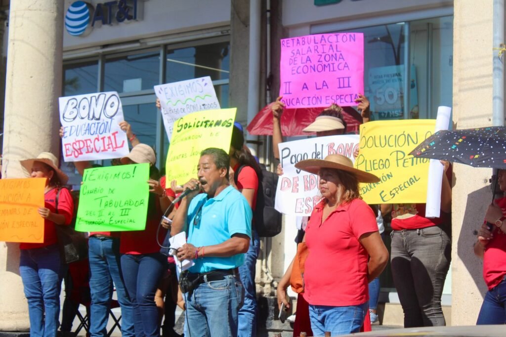 Los manifestantes calificaron como graves los problemas labores que enfrentan, entre las que destacan, la falta de recursos para maestros jubilados, contratación de docentes de apoyo, maestros de comunicación para estudiantes con características especiales y psicólogos.