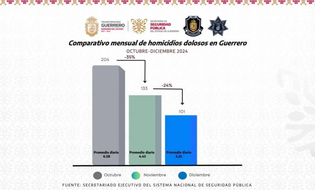 Resultados del Trimestre Octubre-Diciembre 2024: Durante este periodo, Guerrero logró reducir los homicidios dolosos en casi un 50 %. En octubre se registraron 204 casos, mientras que en diciembre la cifra descendió a 101, lo que equivale a un promedio de 3.25 incidentes diarios. Esta disminución significativa refleja el impacto positivo de las acciones implementadas en la entidad.