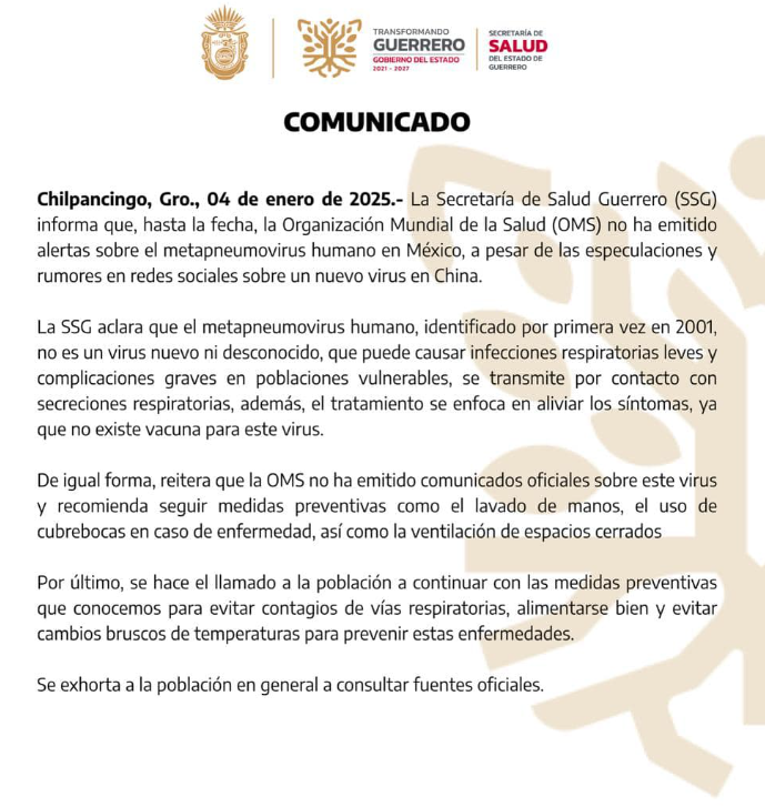 Ante la creciente ola de información en redes sociales sobre el supuesto “Metapneumovirus chino” y su presencia en México, la Secretaría de Salud en Guerrero (SSG) aclaró que no existe ninguna alerta sanitaria relacionada con este virus.