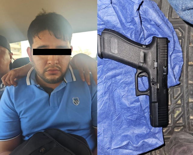 La publicación está acompañada de dos fotografías, una de Alexander “N” quien va detenido al interior de un automóvil y otro de una pistola escuadra.