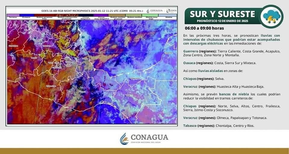 La Comisión Nacional del Agua (CONAGUA) ha emitido un pronóstico de lluvias para el estado de Guerrero durante las próximas horas, principalmente en las regiones de Tierra Caliente, Costa Grande, Acapulco, Zona Centro, Zona Norte y la Montaña.