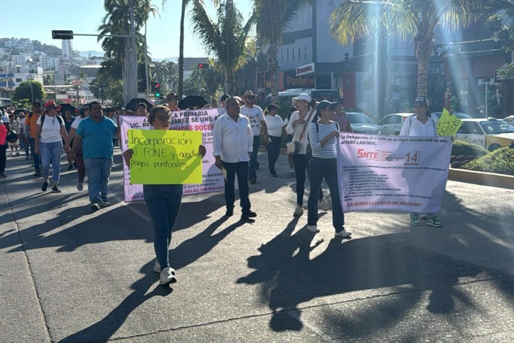 ACAPULCO. —Profesores adscritos a la Sección 14 del Sindicato Nacional de Trabajadores de la Educación (SNTE) marcharon sobre la avenida Costera Miguel Alemán para exigir a las autoridades estatales, se de la incorporación a los docentes que no están incluidos dentro del Fondo de Aportaciones para la Nómina Educativa y Gasto Operativo (FONE).
