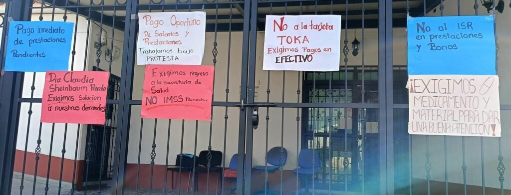 Dejaron en claro que la base trabajadora no pidió la transferencia del sector salud al IMSS-Bienestar y por lo tanto, están exigiendo respeto al contrato colectivo de trabajo y el regreso al sistema anterior, “No al ISR en prestaciones y bonos”, “No a la Tarjeta TOKA, exigimos pagos en efectivo”, “Exigimos medicamento y material para dar una buena atención”, “Basta de robos, no tenemos con que trabajar y pronto tampoco tendremos ni para sustentar un hogar”, se leía en varias cartulinas.