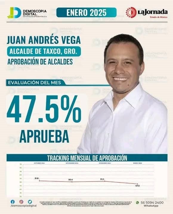De acuerdo con la encuestadora “Demoscopia Digital Estudios de Opinión Publica”, seis de cada 10 taxqueños reprueban los cuatro meses de gobierno del alcalde de Taxco, Juan Andrés Vega Carranza, que llegó al cargo por la alianza de Morena con los Partidos Verde Ecologista de México (PVEM) y del Trabajo (PT); el cuestionado edil, obtuvo apenas un 47.5 por ciento de aprobación ciudadana, mientras el 52.5 por ciento restante se manifestó en contra de esa administración.