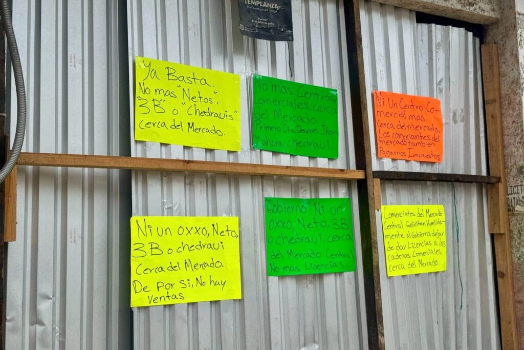 Los manifestantes también llevaron cartulinas con mensajes dirigidos al Gobierno Municipal, en las que solicitan que no se entreguen licencias a cadenas comerciales cerca del Mercado Central.