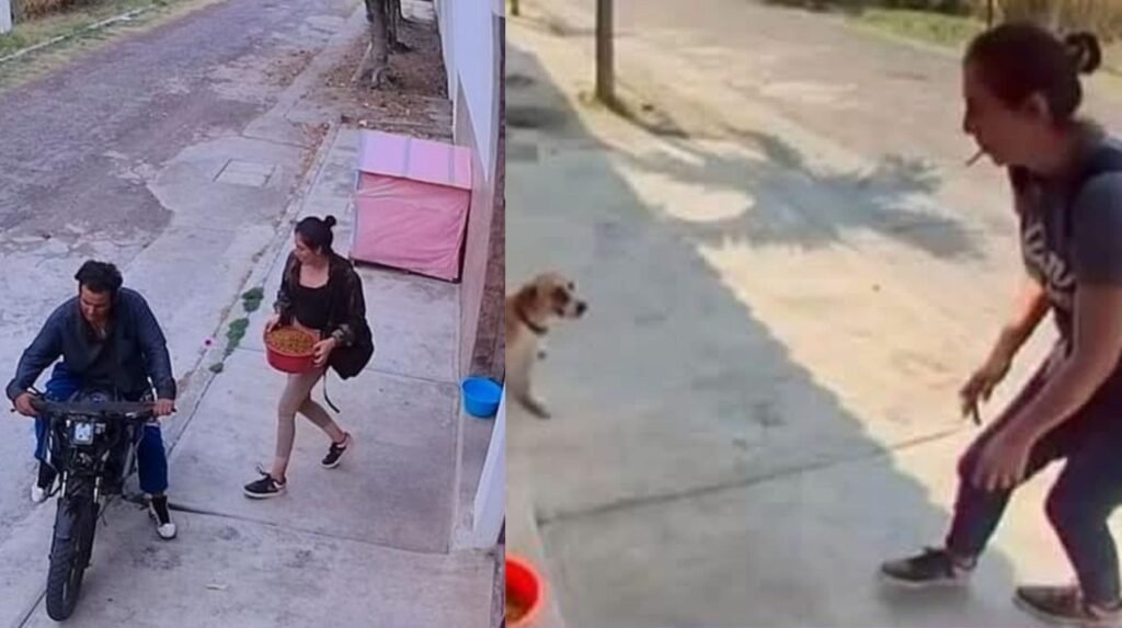 Las imágenes, que rápidamente se volvieron virales en redes sociales, muestran el momento en que los responsables se detienen frente a una vivienda donde se encuentran dos perros, uno marrón y otro blanco. La mujer, que viajaba como pasajera, desciende de la motocicleta y, sin dudarlo, toma un tazón de croquetas colocado para los canes.