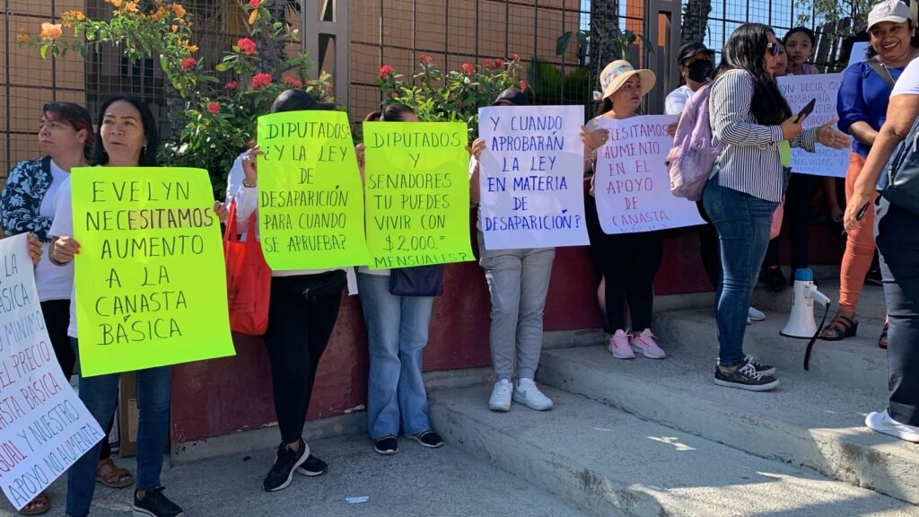Integrantes del colectivo de familiares de personas desaparecidas “María Herrera” y del Centro de Derechos Humanos “José María Morelos y Pavón” protestaron al exterior de Palacio de Gobierno para exigir el pago del bono de despensa, así como la aprobación de la ley de desaparición forzada.
