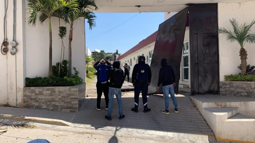 Los estudiantes descendieron de los vehículos y se apoderaron de una camioneta de la empresa “Marinela” con la que derribaron ambos accesos del inmueble.