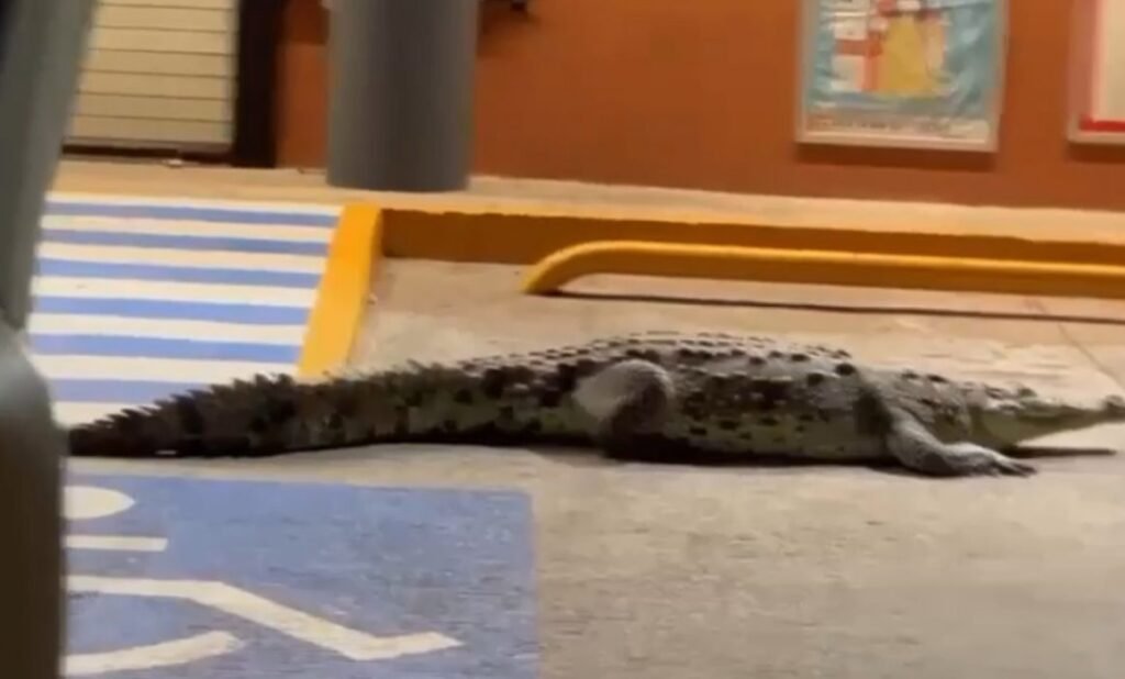 En un video que se ha difundido ampliamente, se observa al reptil inmóvil a las afueras del establecimiento, sin mostrar señales de agresividad.