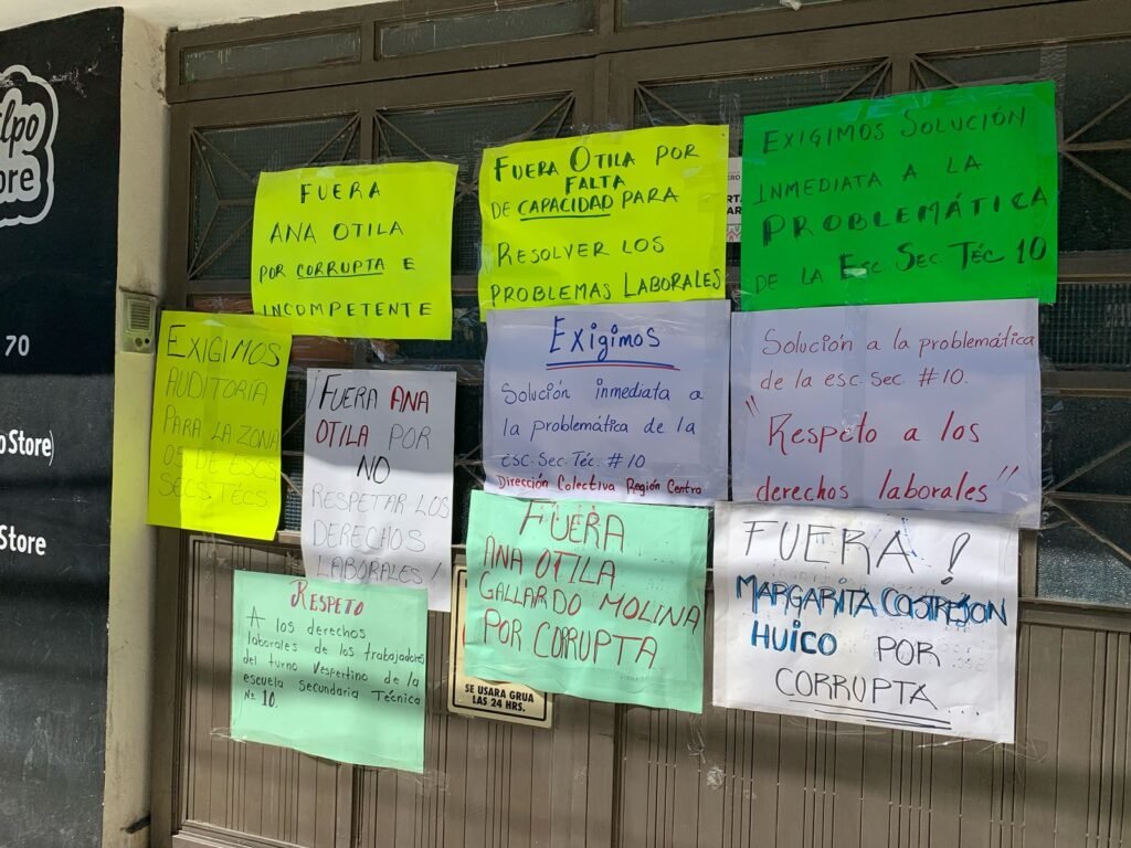 En las pancartas se pudieron observar leyendas como “solución inmediata a la problemática de la esc. sec. téc #10”, “respeto a los derechos laborales”, entre otros.