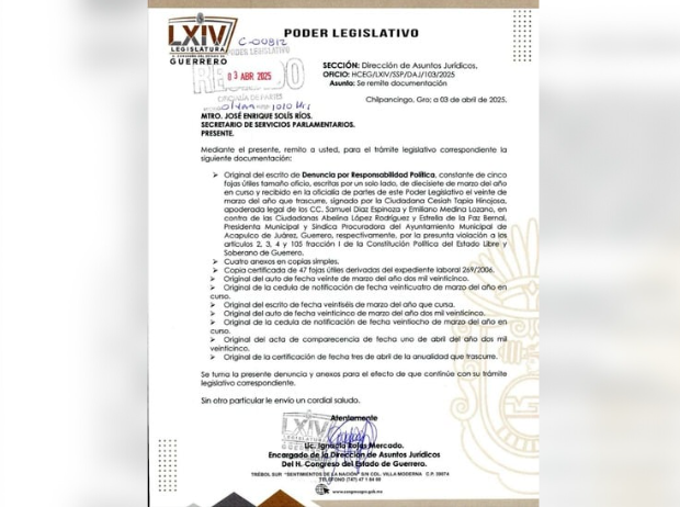 El Congreso del Estado ha turnado la denuncia y sus anexos a las instancias correspondientes para dar seguimiento al trámite legislativo previsto en la ley. Y se espera que, en las próximas semanas, se determine si procede iniciar un juicio político u otra medida de responsabilidad conforme al marco normativo.