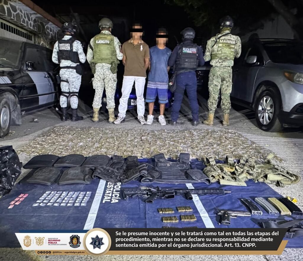 Elementos de la Policía Estatal, en coordinación con el Ejército Mexicano, Guardia Nacional, Marina y Fiscalía General del Estado, detuvieron a dos hombres armados en posesión de droga y equipo táctico en la colonia Luces en el Mar, Coyuca de Benítez.