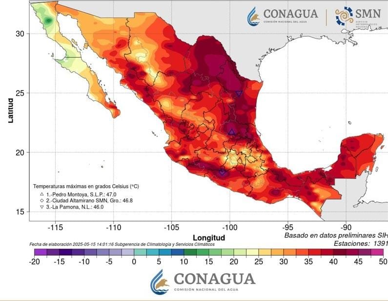 El SMN advirtió que la ola de calor continuará expandiéndose hacia el sureste del país, alcanzando a Tabasco, mientras que temperaturas superiores a los 45 grados persistirán en estados como Nuevo León, Tamaulipas, Michoacán y Guerrero.