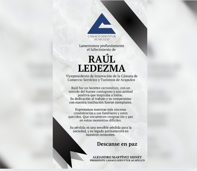 A través de un comunicado firmado por el presidente de la CANACO SERVYTUR de Acapulco, Alejandro Martínez Sidney, lamentó el fallecimiento del también empresario, a quien reconoció como una persona trabajadora y responsable.