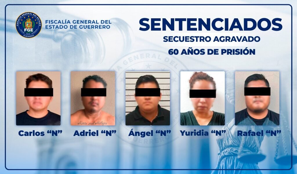La Fiscalía General del Estado de Guerrero (FGE) logró una sentencia condenatoria de 60 años de prisión en contra de cinco personas por el delito de secuestro agravado, cometido en octubre de 2022 en la capital del estado.
