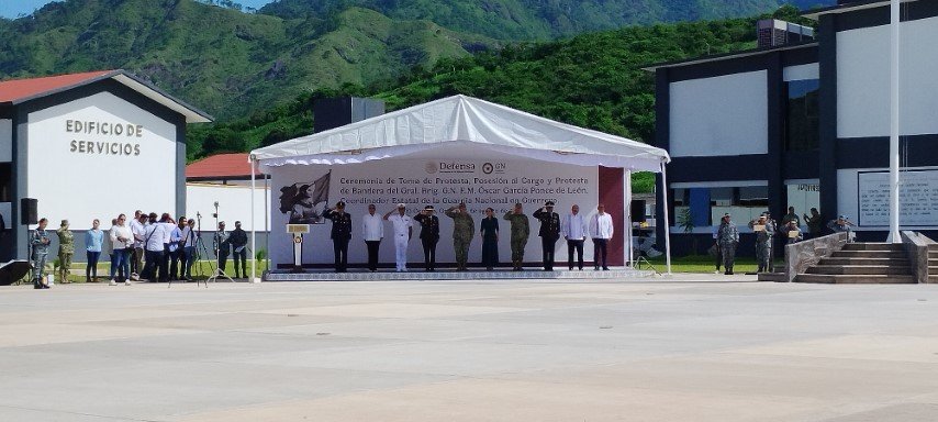 Este martes, la gobernadora asistió como invitada a la ceremonia de toma de protesta del nuevo coordinador estatal de la Guardia Nacional (GN) Oscar García Ponce de León, quien en su larga trayectoria militar señala que fue jefe de estado mayor del mando especial de la GN en Acapulco, jefe de atención especial a los robos en ductos de combustible de Pemex.